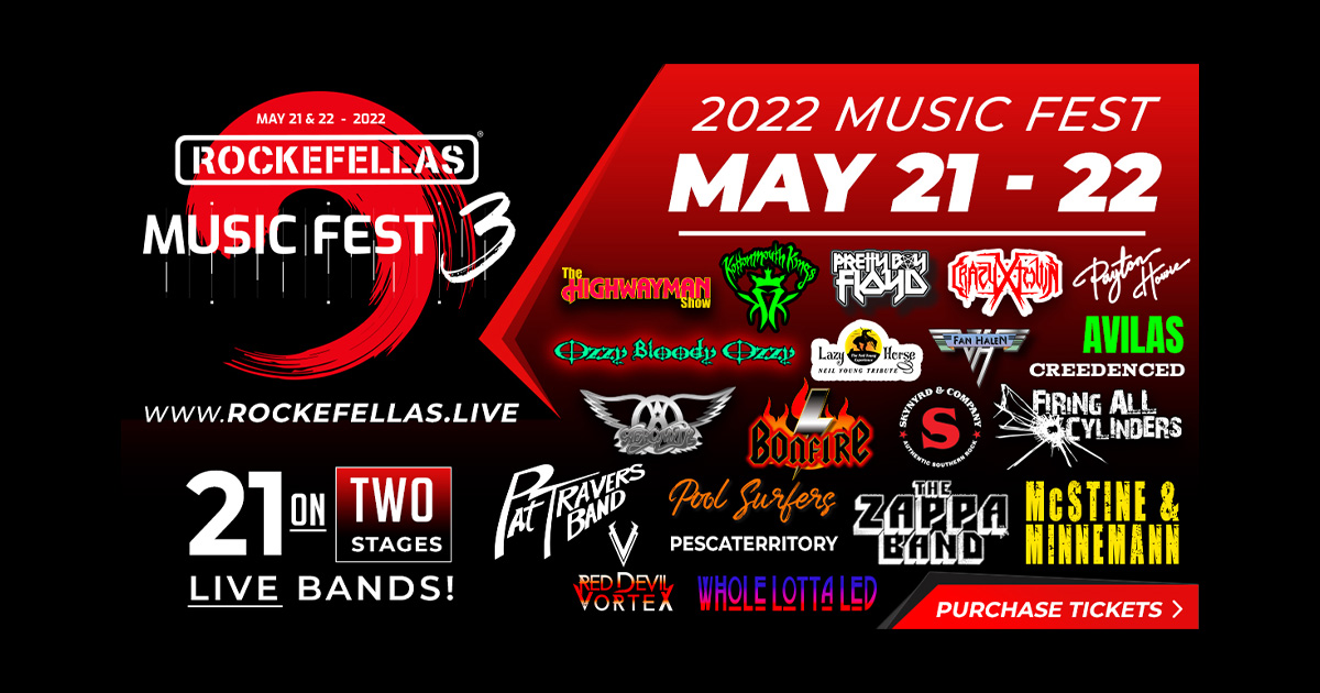 Welcome to the Rockefelllas Music Fest website where you can see our lineup of talented artists that will be performing live on May 21st through May 22nd, 2022. MCSTINE & MINNEMANN, THE HIGHWAYMAN SHOW, SKYNYRD & COMPANY, WHOLE LOTTA LED, POOL SURFERS, ZAPPA BAND, THE AVILAS, PAYTON HOWIE, LAZY HORSE, CREEDENCED, PESCATERRITORY, PAT TRAVERS, KOTTONMOUTH KINGS, CRAZY TOWN, AEROMYTH, PRETTY BOY FLOYD, FAN HALEN, BONFIRE, FIRING ALL CYLINDERS, OZZY BLOODY OZZY, RED DEVIL VORTEX!!! LIVE! Music Fest, Banning, CA 92220