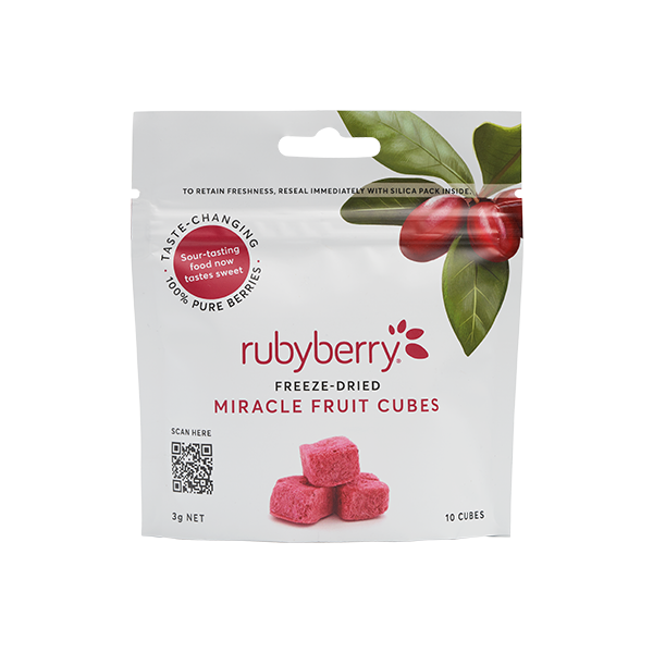 Rubyberry Miracle Fruit® Cubes can make sour-tasting food and drinks taste sweet. Miracle fruit contains Miraculin, a taste-modifying protein which activates the taste receptors on the tongue.