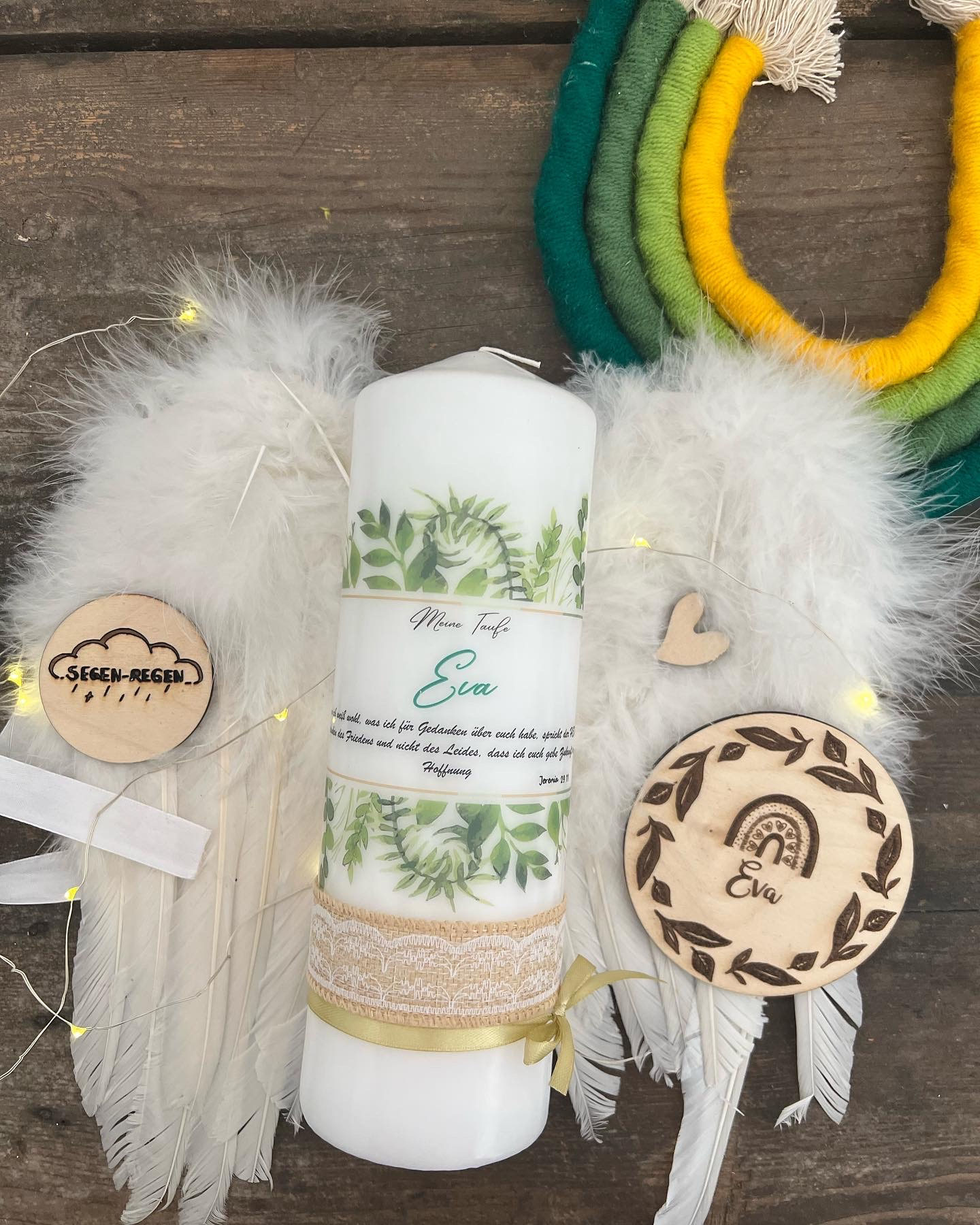 Bei Segen-Regen bekommt ihr nicht nur eine wunderschöne Taufkerze, sondern auch ein paar schöne Accessoires.Hier könnt ihr Caketopper, Einladungskarten oder ein Patengeschenk zusammen mit der Kerze personalisiert erwerben.