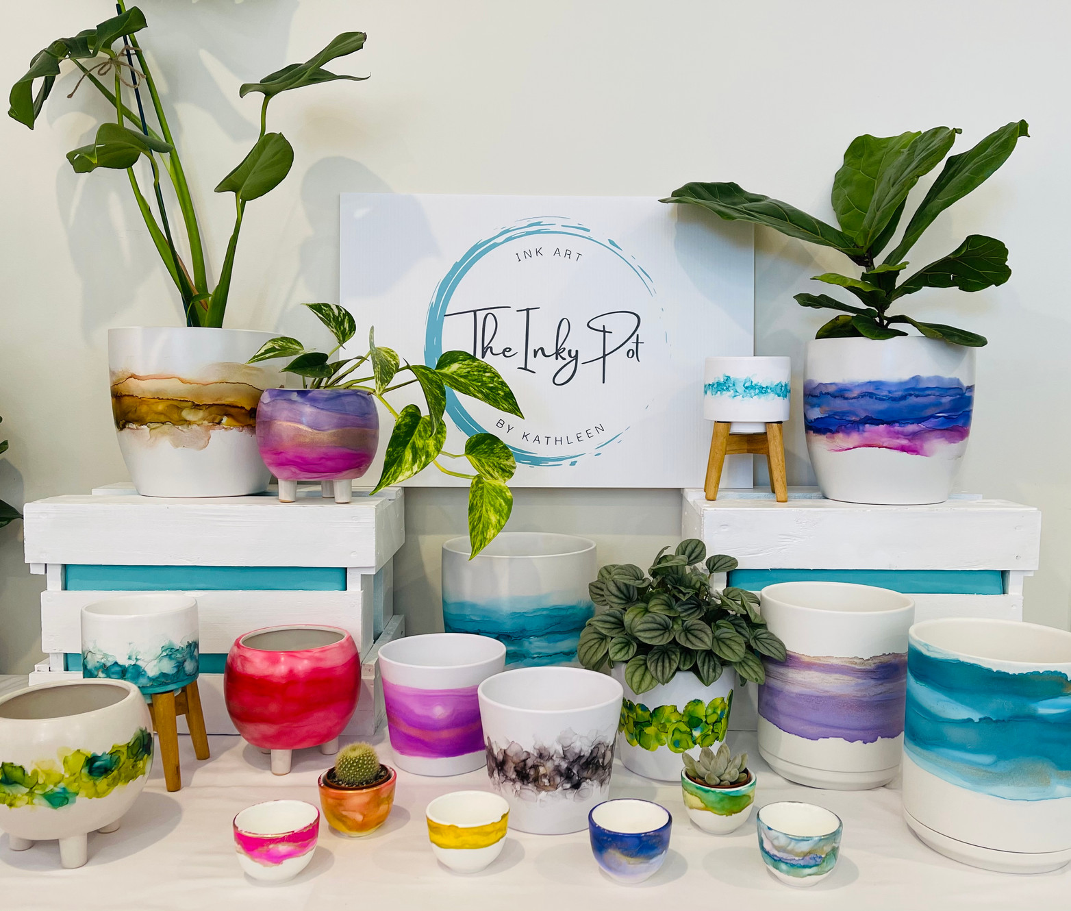 A variety of fantastic and unique hand painted plant pots and other seasonal items. Alcohol Ink Art from Dunedin New Zealand.