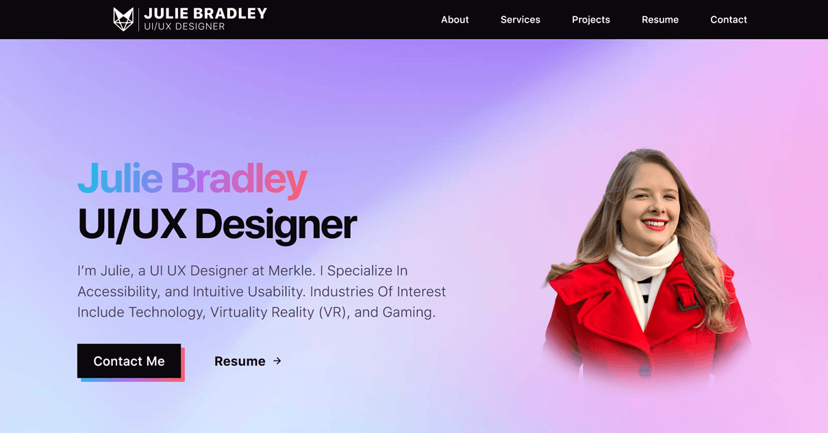 UI UX Designer Portfolio of Julie Bradley | Specialties: Accessibility and Intuitive Usability. Industries Of Interest: Technology, Virtual Reality (VR), and Gaming.
