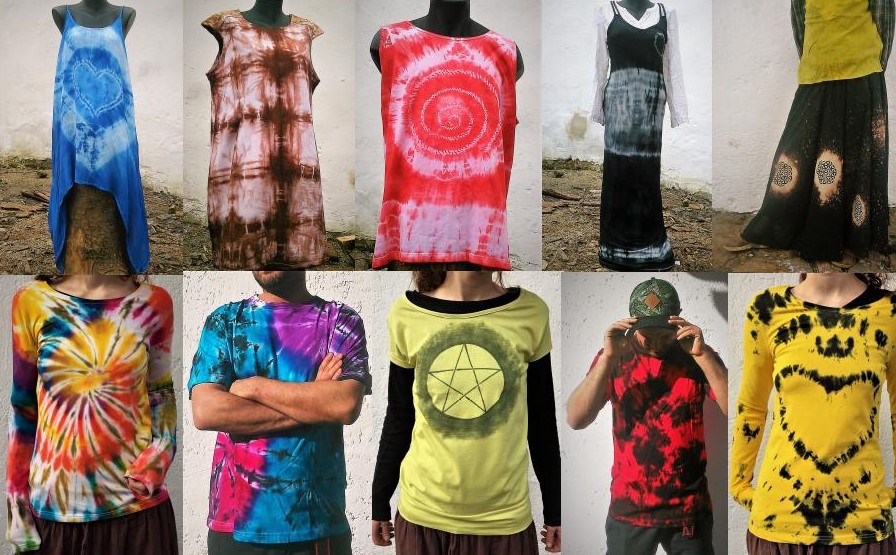 Batikovaná trika, sukně, šátky, tašky, dále si zde můžete vybrat tričko se stromem, dělám indiánské náramky a lecos jiného