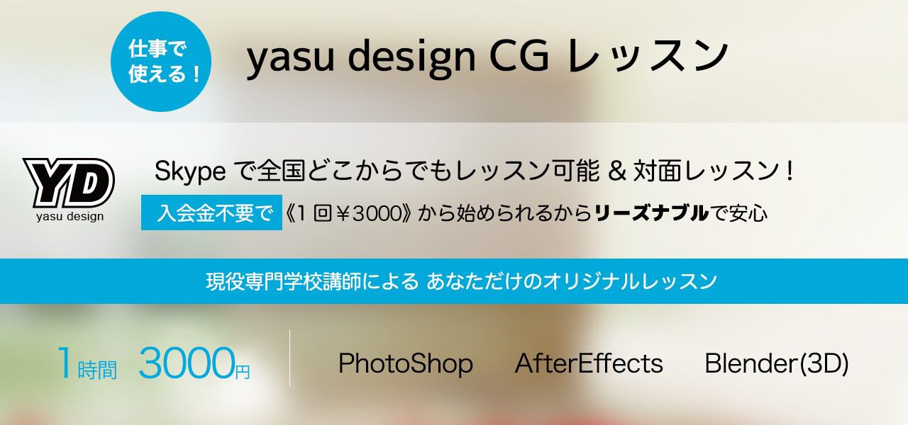 yasu design(ヤスデザイン)のCGスクールのショップです!カフェでコーヒーを飲みながら又はSkypeを用いてリラックスしてのレッスンです。フリーランスで3DCG、映像制作しております又、 専門学校で3DCG、映像の非常勤講師もしてます。 ホームページ http://www.yasudesign.com/Cyta.jp認定コーチ