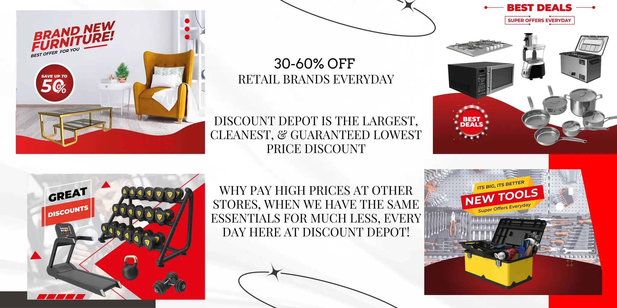 Discount Depot is the largest discount store in League City, Texas! Deals on excess inventory, such as Tools, Home Goods, Sporting Goods, Clothing, and more from Top Retailers! 50% OFF of retail prices!!